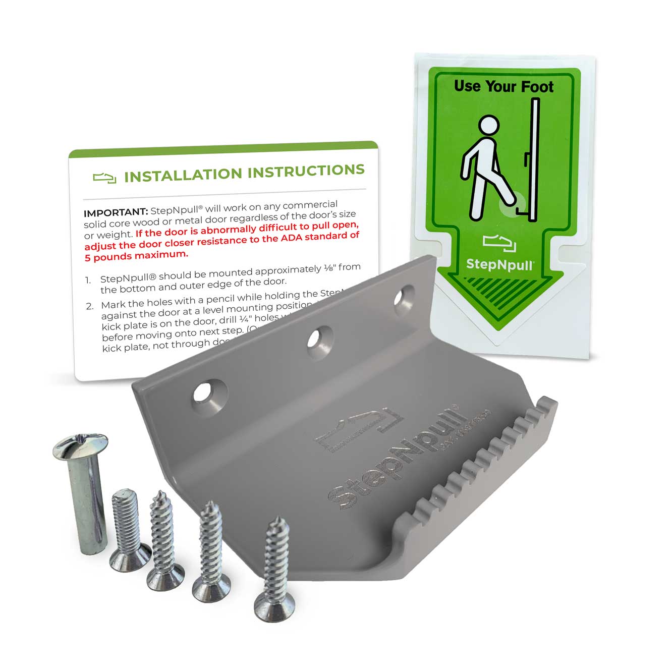 The StepNpull foot operated door pull mounts on any commercial latch-less wood or metal door, and gives the user the option of pulling the door open with their foot instead of the door handle. With StepNpull, the weight of the door is not a factor. If an interior door closer resistance is adjusted to the ADA standard of 5 pounds or less, then the user will be able to easily open the door with their foot using StepNpull. We've put 13 years of work into perfecting and testing the quality of the StepNpull product to ensure it lasts.