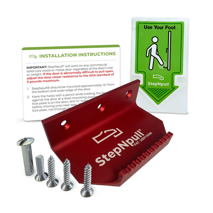 This beautiful red StepNpull® is sure to get noticed on any commercial wood or metal door on your business. Our foot-operated, hands-free door pull comes complete with mounting screws, a barrel bolt, door decal, and installation instructions. StepNpull’s distinctive sleek design was crafted in 2007 and includes trademarked angled front edges. International shipping applies. Canada orders please visit StepNpull.ca
